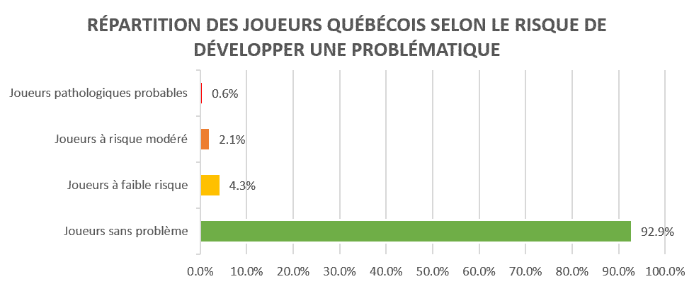 Selon l’étude de Kairouz et Nadeau il y aurait environ 0,4 % de la population adulte totale qui serait des joueurs pathologiques probables et 1,4 % des joueurs à risque modéré. La population adulte du Québec en 2019 est de 6 900 109 selon l’institut de la statistique du Québec : http://www.stat.gouv.qc.ca/statistiques/population-demographie/structure/population-quebec-age-sexe.html.