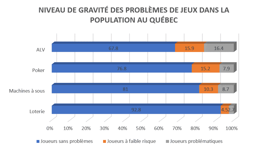 Selon la même étude de 2012 de Kairouz et Nadeau, les jeux de hasard et d’argent les plus populaires chez les Québécois sont la loterie (91 % des joueurs), les machines à sous (14,6 % des joueurs), le poker (7 % des joueurs), le bingo (6,3 % des joueurs) et les ALV ou appareils de loterie vidéo (6,2 % des joueurs). Or, ces jeux ne présentent pas les mêmes risques de développer des problèmes.