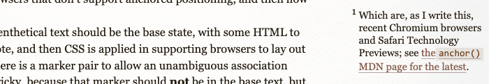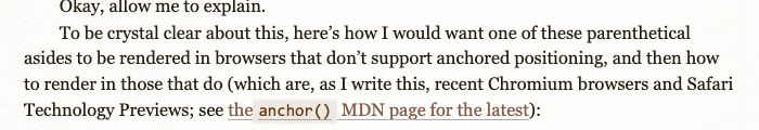 Adding that window.matchMedia to the if statement’s test means all the DOM and content massaging will be done only if the browser understands anchor positioning and the window width is above 65 ems, which is my site’s first mobile media breakpoint that would cause real layout problems. Otherwise, it will leave the asidenote content embedded and fully parenthetical. Your breakpoint will very likely differ, but the principle still holds.