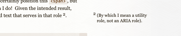 I went through a lot of that CSS in the previous post, so jump over there to get details on what all that means if the above has you agog. I did add a few bits of text styling like an explicit line height and slight size reduction, and changed all the asidenote classes there to aside-note elements here, but nothing is different with the positioning and such.