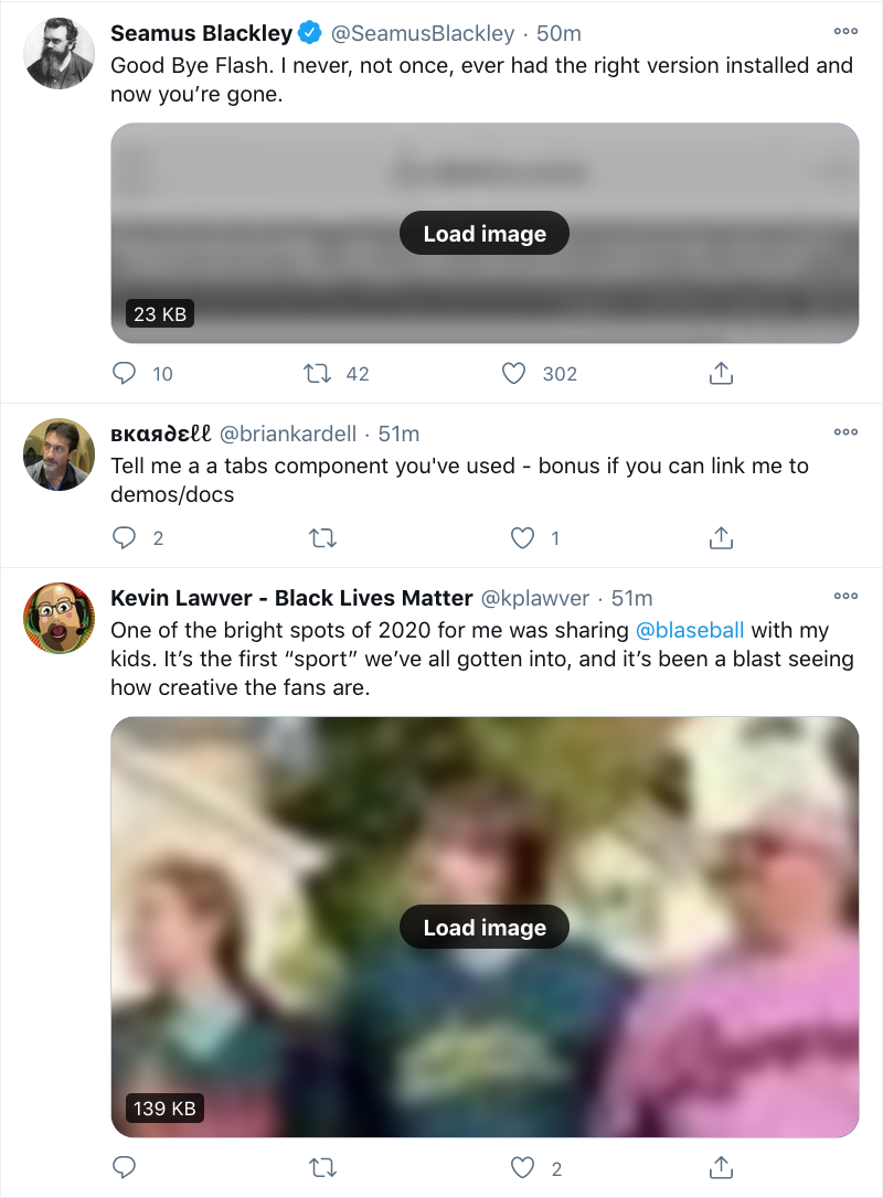 Three consecutive tweets from my timeline on Friday, January 1st, 2021. The blurring of the images in the top and bottom tweets is an effect of the Data Saver preference, not my CSS.