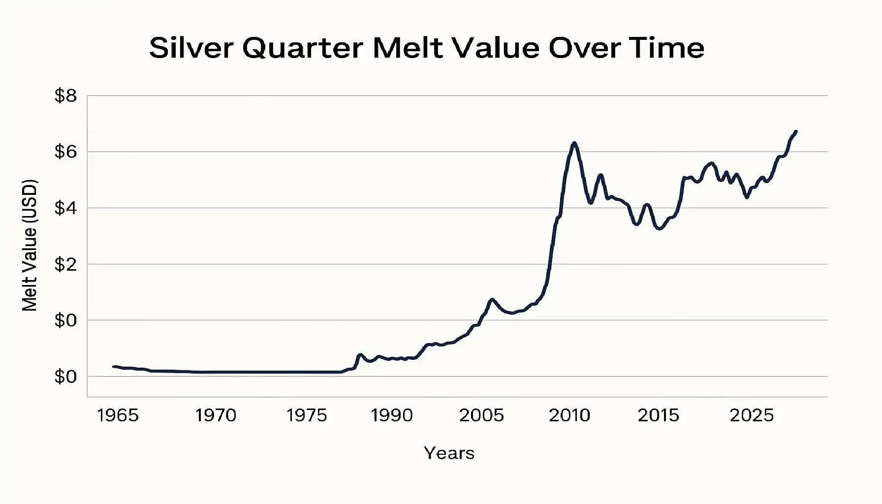 In 2025, those same 6 1/2 silver quarters have a melt value of about $53. Today's minimum wage is $7.25 per hour...not even enough to buy one silver quarter.