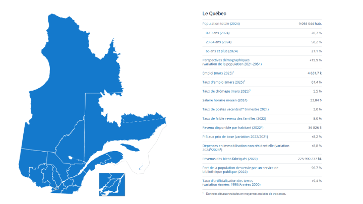 Economic, demographic, cultural and environmental indicators for all of Québec, its administrative regions and their RCMs. Latest update: Employment, Employment rate, Unemployment rate.
