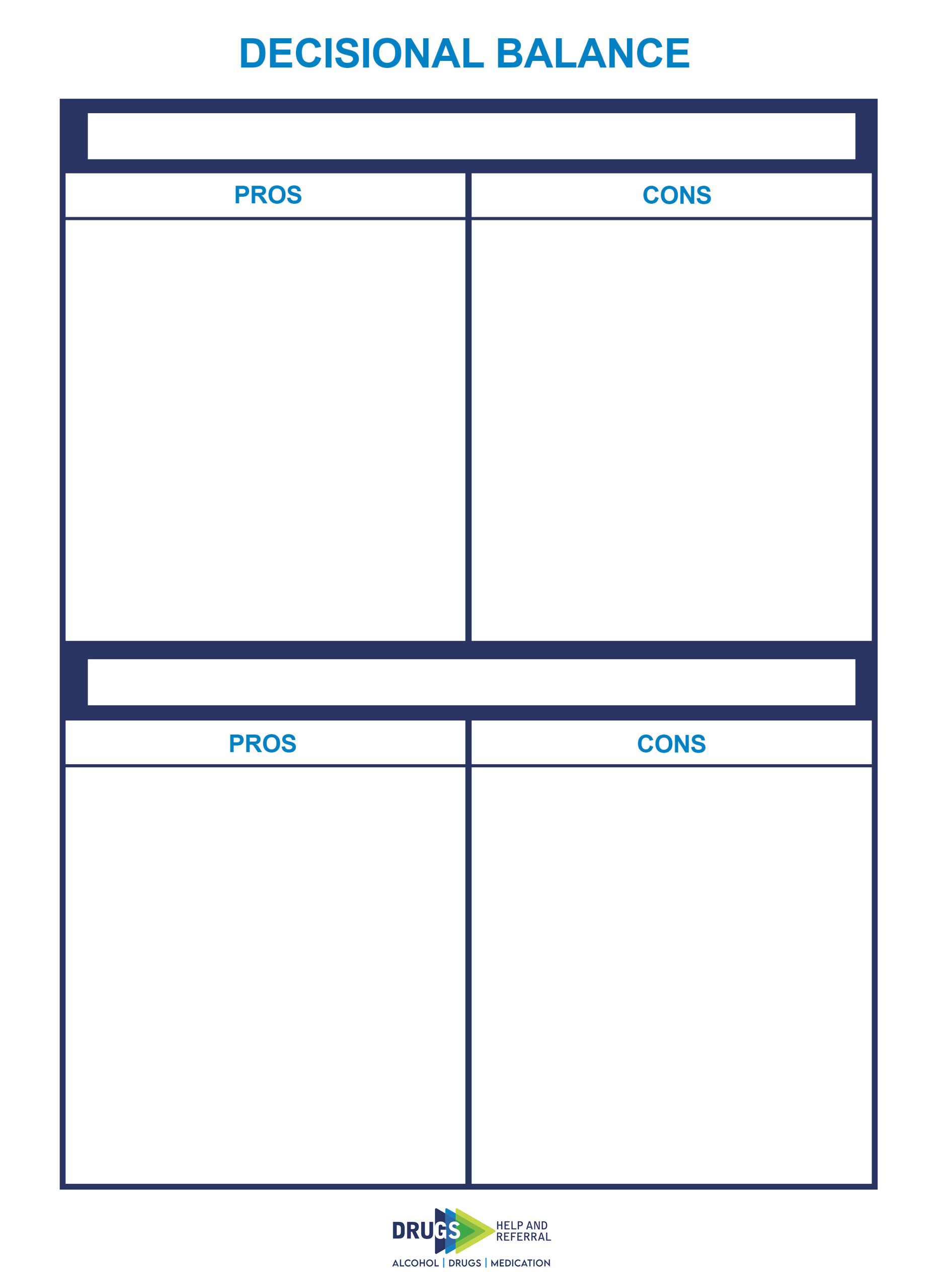 The decisional balance aims at comparing the benefits/pros and costs/cons of two situations: