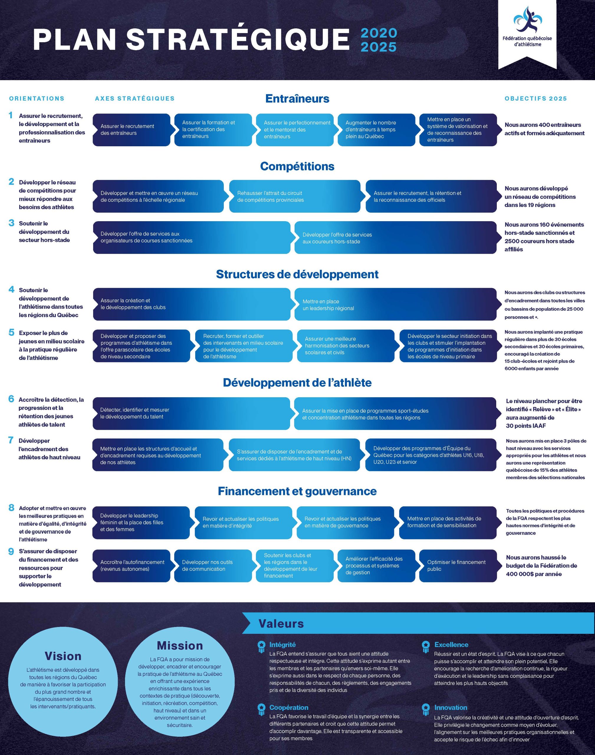 Le plan stratégique 2020-2025 d’Athlétisme Québec s’articule autour de cinq piliers de développement et de neuf orientations stratégiques. La stratégie générale visée est la croissance de l’athlétisme et ce, partout au Québec.
