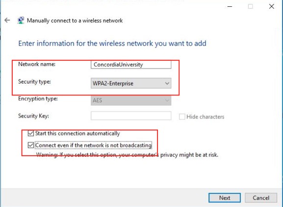 1. Adding a new wireless network name "ConcordiaUniversity"