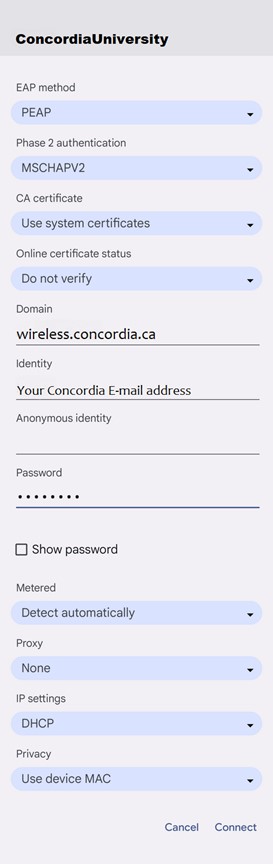 Concordia University provides wireless networking for all of its currently active faculty, staff, and registered students. In order to ensure adequate security, most devices must be configured manually before using the wireless for the first time. Please select your device or operating system from the list in the documentation section for full configuration details. To connect to Concordia's wireless network with a configured device, you must have a Netname account. Please ensure that you have activated your netname before configuring your device.