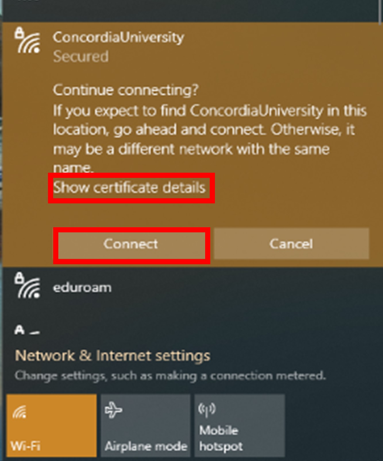 Note: You will see a Windows Security Alert message saying "Continue connecting? If you expect to find ...." Please click Connect. If you click “Show certificate details”, the certificate should be issued to CA, QC, Montreal, Concordia University, IITS, wireless.concordia.ca and issued by ‘GlobalSign …’.