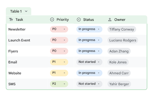 Voeg snel structuur en een professionele uitstraling toe aan gegevens met tabellen. Gebruik smartchips om gegevens zoals namen, bestanden en datums toe te voegen door @ te typen. Of gebruik vooraf gemaakte tabellen om evenementen te plannen, projecten of voorraad te beheren in plaats van een spreadsheet helemaal zelf te maken.